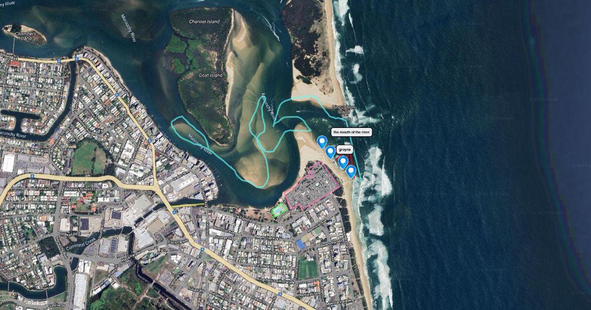 this map outlines the pool and the caravan park. The map also features the four rock groins. the river is also outlined in its current shape