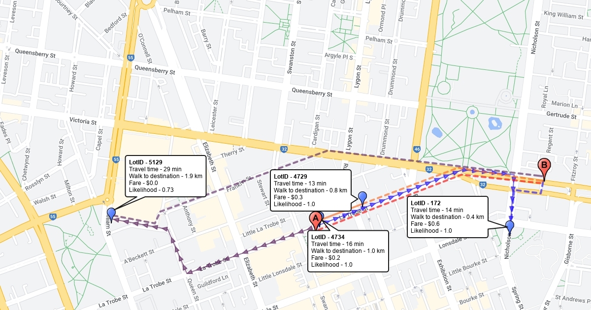 \begin{figure}[h!] \centering \includegraphics[width=0.9\textwidth]{./figures/melbourne-qvmarket2eureka1} \caption{Routes with recommended parking lots in Melbourne CBD, VIC, Australia [source location: Queen Victoria market (A); destination location: Eureka Skydeck (B)] } \label{fig:melbourne-qvmarket2eureka} \end{figure}
