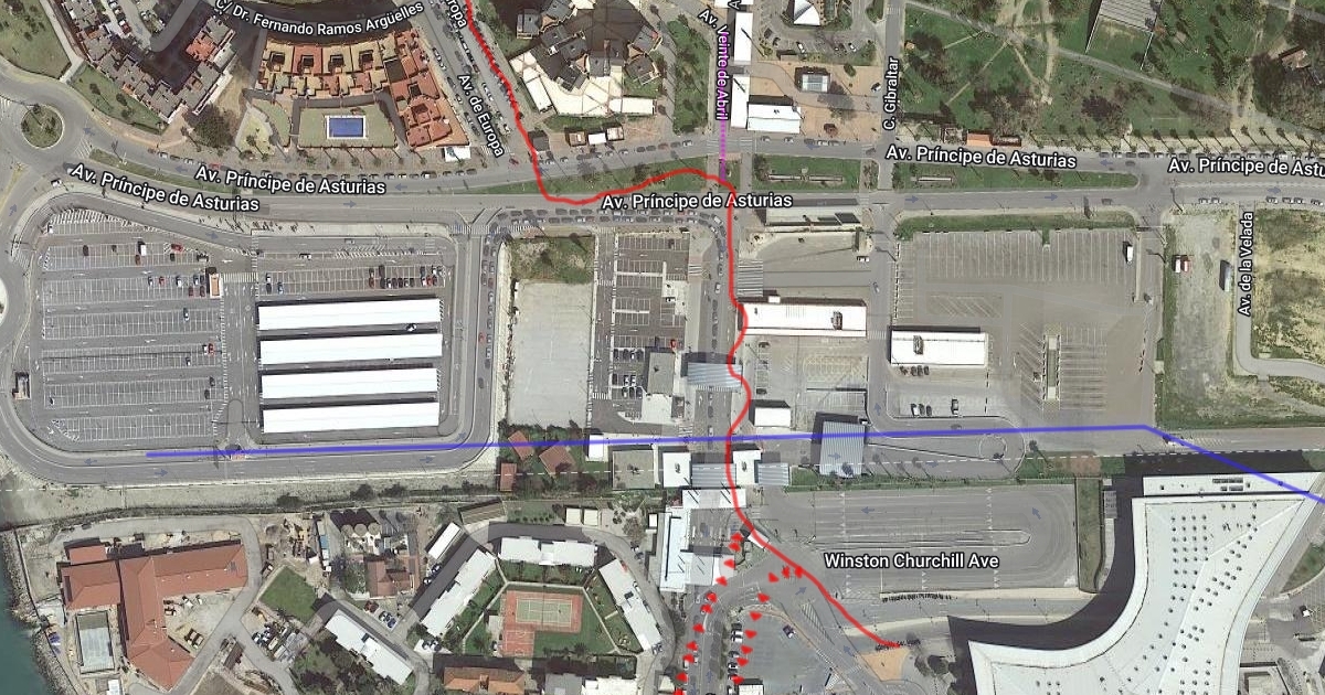 solid red line is from airport to bus station arrow line is detour to Eroski in Gibraltar (big) Pink dotted line is street where there might be a minimarket.