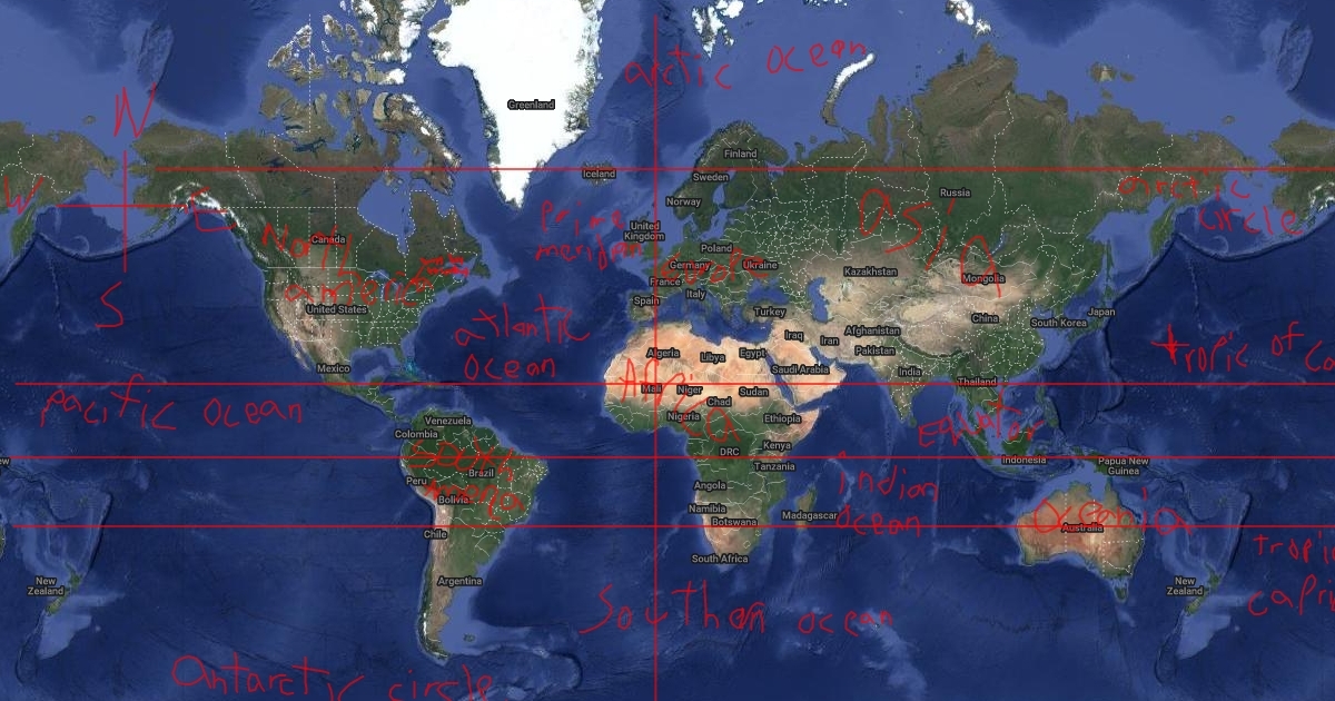 a world map with the 7 continents, 5 oceans, and 5 lines of lattitude